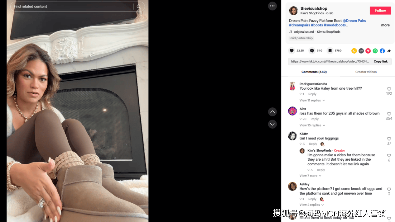 合作视频是一条典型的性价比好物推荐,thevisualshop用“$160 vs $48”的价格对比开场,迅速吸引观众注意,随后展示了仅$48的Dream Pairs鞋子,强调其高质感与细节优势,带缎带设计、防水、2英寸厚底、真皮绒面材质、内置记忆海绵等,整体语气自然真诚,画面简洁明快。